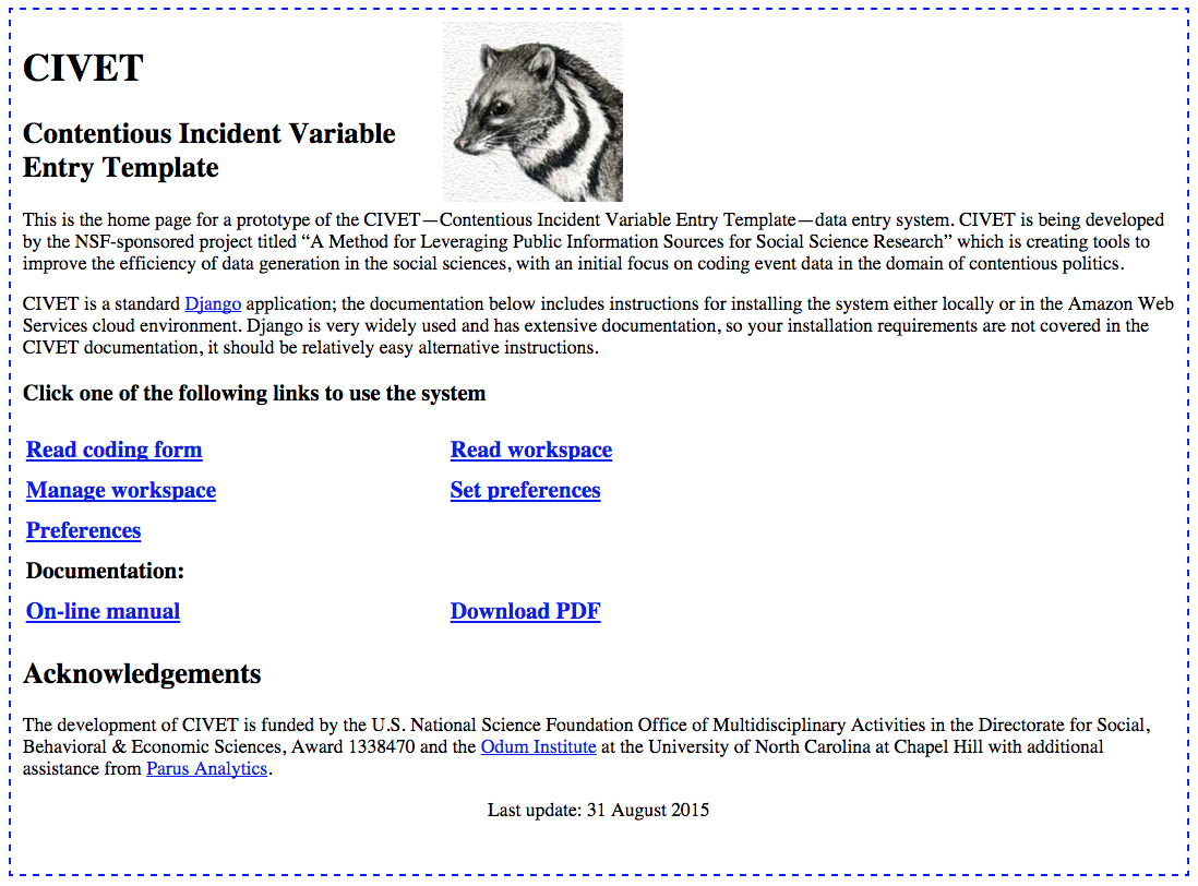 sudo pip install Django: you will need administrative access to do this. - Download the CIVET system from https://github.com/civet-software/CIVET-Django, unzip the folder and put it wherever you would like