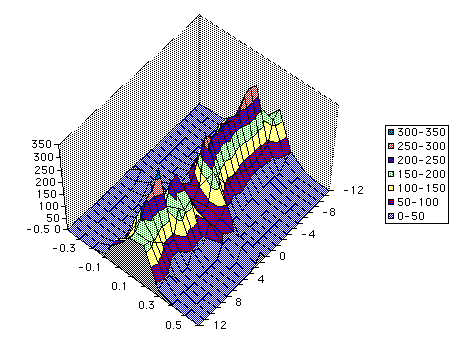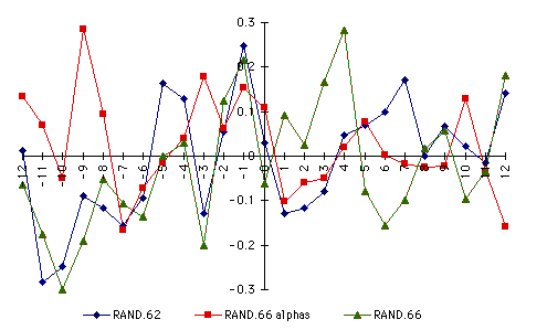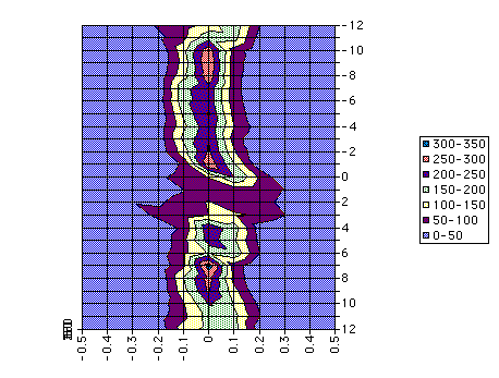 with each value; horizontal dimension sums to 512 for each lag/lead. Remarks: Distribution of cross-correlations; 512 Monte Carlo